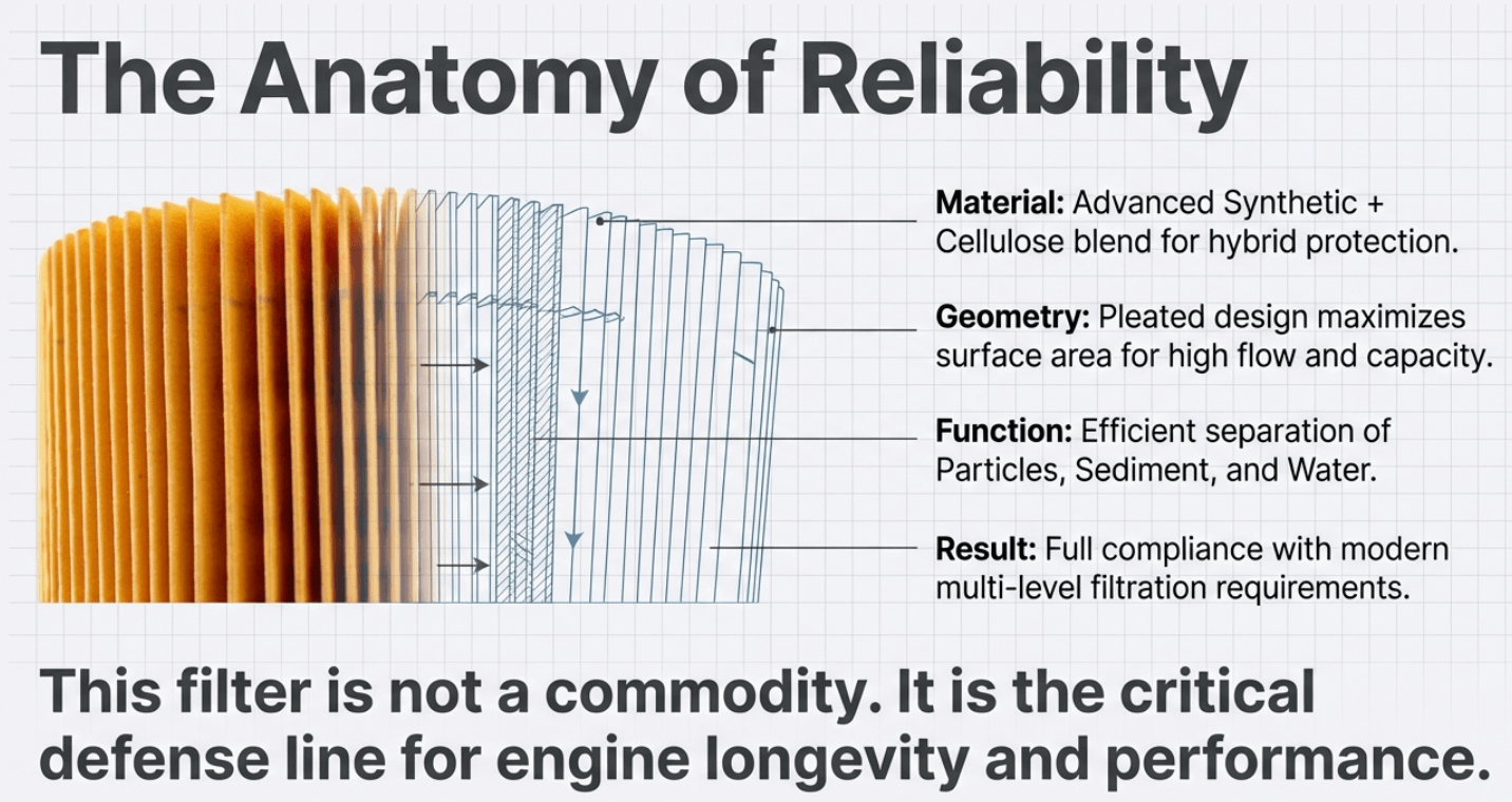 Our filter media removes particles while maintaining flow rates required for proper oil pressure across complete operating ranges. Pleated construction maximizes filtration surface area within compact dimensions, increasing dirt-holding capacity so filters remain effective throughout oil change intervals.