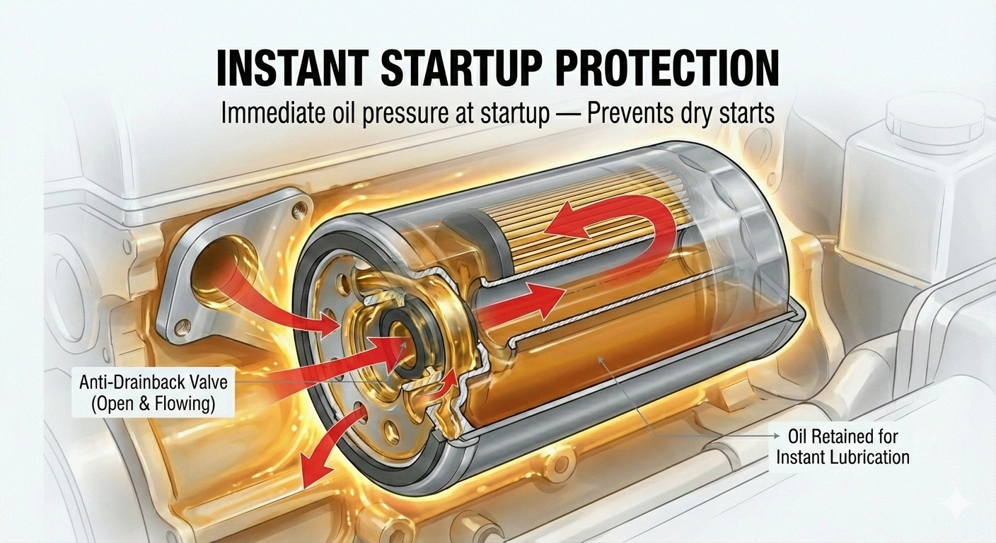Anti-drainback valves prevent oil from draining out of the filter when the engine is stopped, ensuring immediate oil pressure when the engine restarts instead of the bearings running dry. This feature is particularly useful for engines where the filters are mounted horizontally or upside down.
